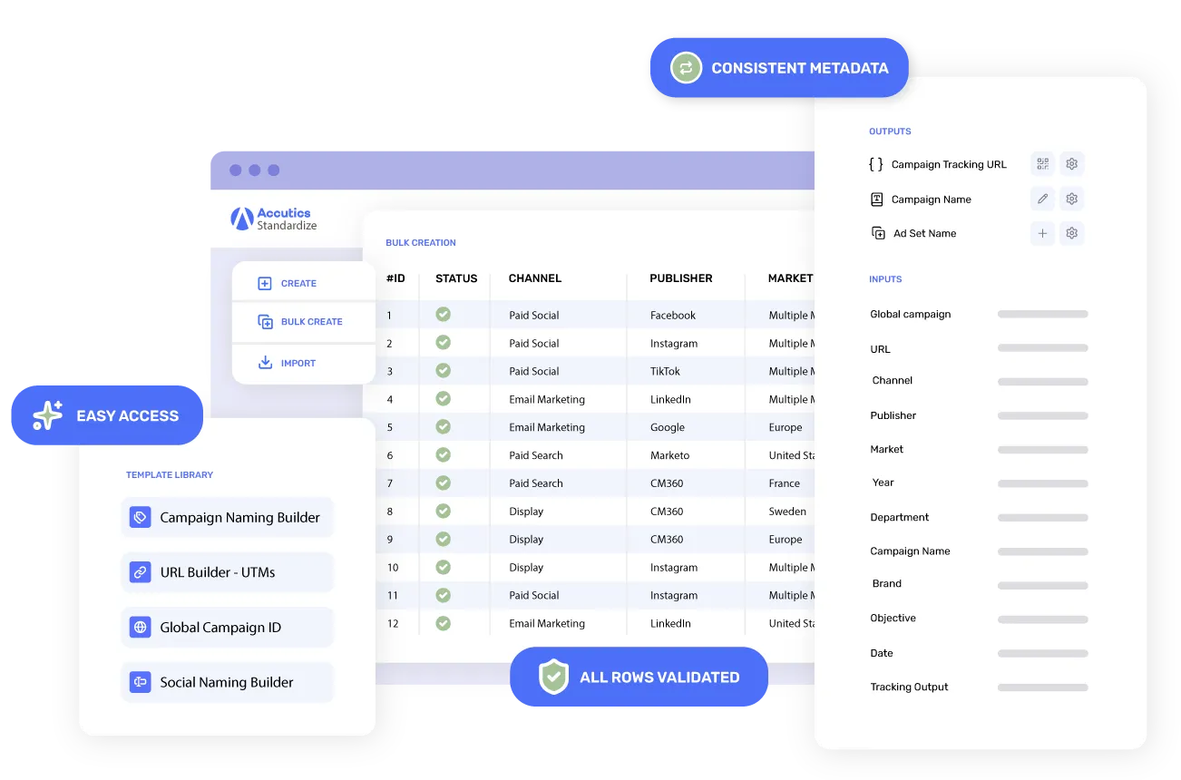 Create a clear and unified structure for naming, metadata, and URL parameters in one place. Accutics removes variations so marketers spend less time fixing data and more time improving performance.